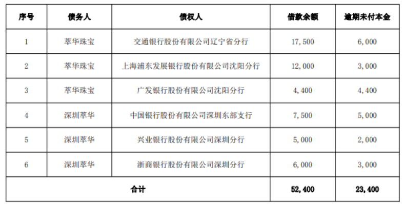 在公告中,萃华珠宝详细列出了逾期债务明细。涉及的债权人包括交通银行股份有限公司辽宁省分行、上海浦东发展银行股份有限公司沈阳分行、广发银行股份有限公司沈阳分行、中国银行股份有限公司深圳东部支行、兴业银行股份有限公司深圳分行、浙商银行股份有限公司深圳分行等六家银行的分支机构。
